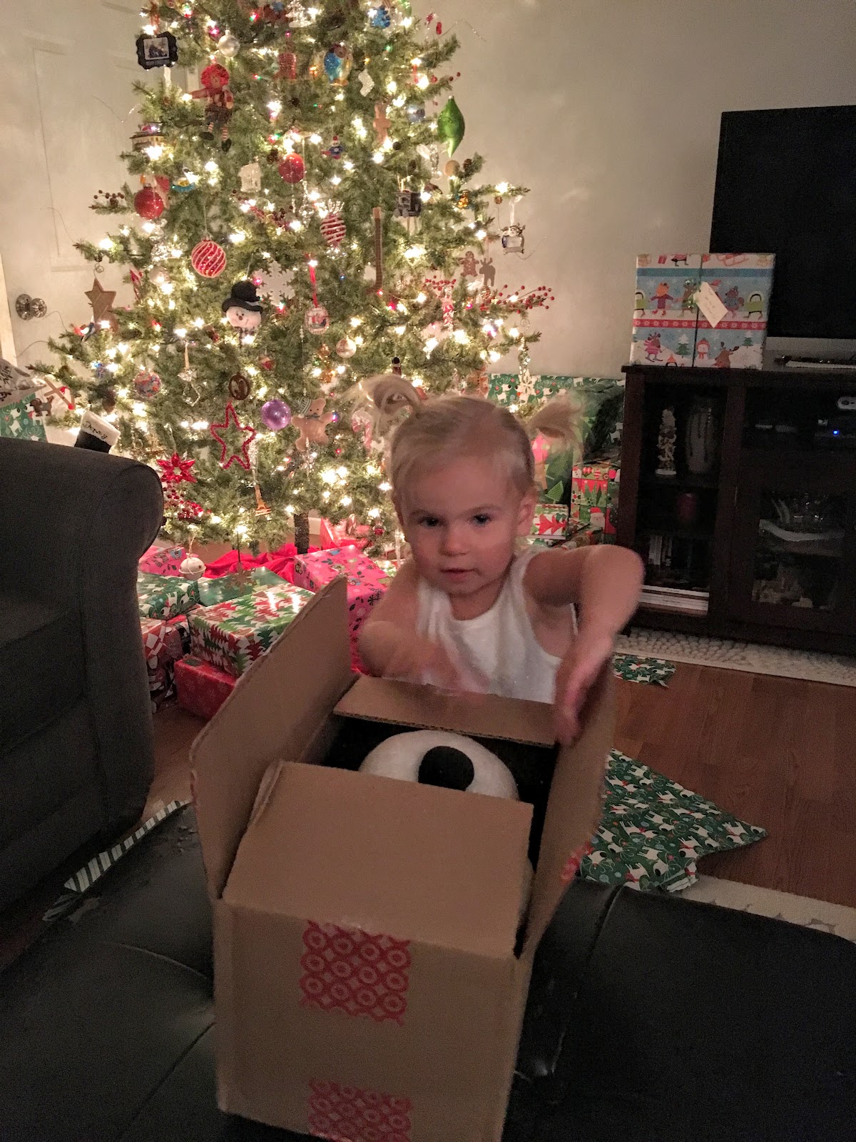 The tot was pleasantly surprised with all of her gifts and was even happy to help open a few small things that Santa left for her little brother.  After we cleaned up the abundance of wrapping paper that filled the living room, Jake and I took turns opening our stockings. Mine was filled with new maternity clothes while Jake's was stuffed with golf balls, socks & underwear, and lots of treats. Don't worry, the tot made sure to help him devour half of that bag of Lindt white truffles before bedtime.